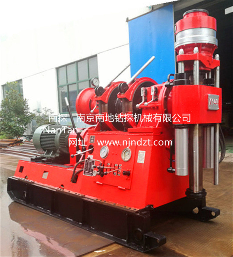 特點:具有較多的轉速級數(shù)(8級)和合理的轉速范圍,低速扭矩大(最大達3200牛頓·米),既適合以合金、金剛石巖心鉆進,也可用于工程地質勘察,水文水井鉆進和基礎樁工程施工。立軸通孔直徑大(直徑93毫米),雙軸缸液壓給進,行程較長(可達600毫米),工藝適應性強,特別適合大直徑鉆桿繩索取心(上部取心)鉆進,有利于提高鉆進效率和減少孔內事故。重量輕,可拆性好,鉆機凈重2300千克,主機可分解為10個部件(最大可拆部件重量300千克),搬遷方便,宜于山區(qū)工作。 液壓卡盤采用雙向供油并裝有液壓鎖,卡盤夾持力大,夾持穩(wěn)定。 配有水剎車,深孔鉆進,下鉆平穩(wěn)安全。采用單聯(lián)齒輪油泵供油,安裝簡單,方便使用,功率消耗少,液壓系統(tǒng)油溫低,工作穩(wěn)定。系統(tǒng)中裝有手搖油泵,當動力機不能工作時仍可用手搖油泵起出孔內鉆具。 鉆機結構緊湊,布局合理,所有部件表露在外,不相互重迭,便于維護、保養(yǎng)和修理。重心低,移車距離長(可達460毫米),固定牢靠,高速鉆進穩(wěn)定性好。 配有防震儀表,儀表壽命長,利于掌握孔內情況。操縱手把較少,操縱靈活可靠。通用化程度高,該機與XY-4型鉆機通用件達60%,與XY-42型鉆機通用件達75%。
